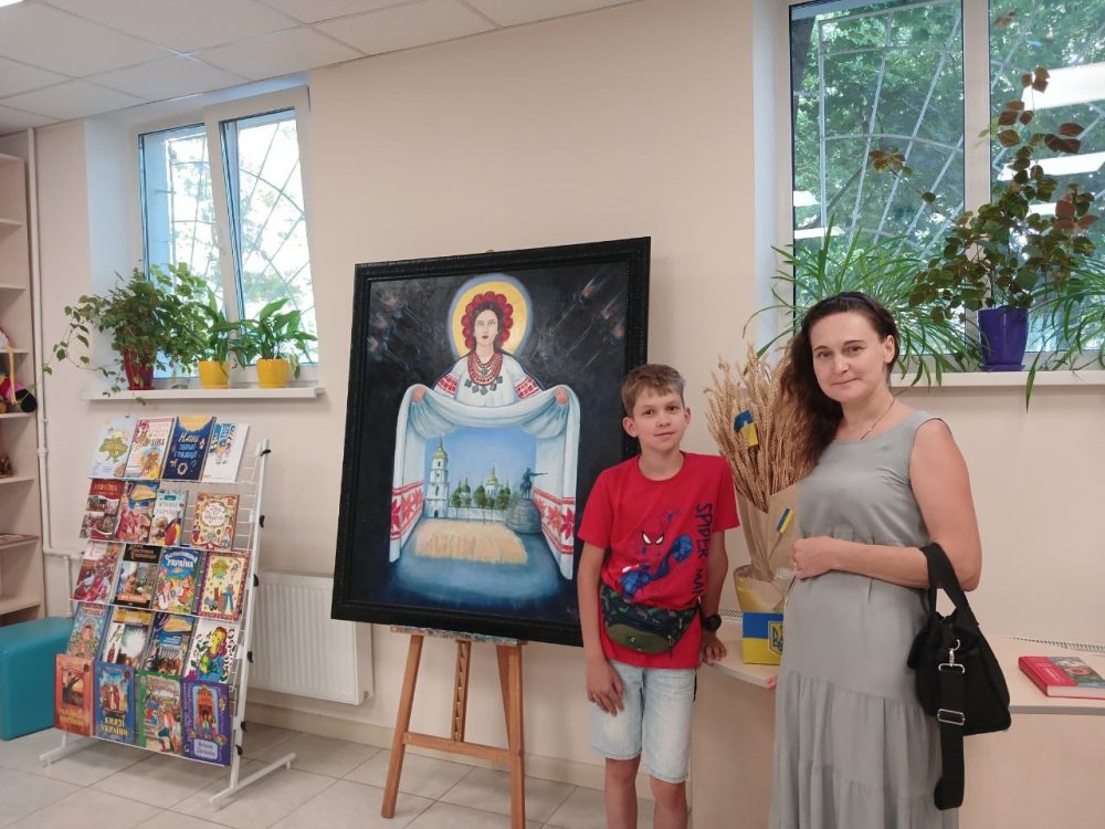 “Покрова Пресвятої Богородиці України” – так назвала пані Інна свою роботу. В ній центром стало саме символічне зображення Богородиці, яка захищає своїми силами Україну від ворожої російської агресії.