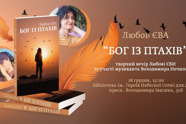 28 грудня в бібліотеці ім. Героїв Небесної Сотні для дітей відбулася камерна творча зустріч письменниці і мисткині Любові ЄВИ. Під музичний супровід музиканта Володимира Нечипорука було презентовано її нову книгу “Бог із птахів”. Роман вийшов цьогоріч в ЛА “Піраміда”. Любов працює у жанрі романів-притч і може своєю творчістю нагадати когось на кшталт Річарда Баха чи…
