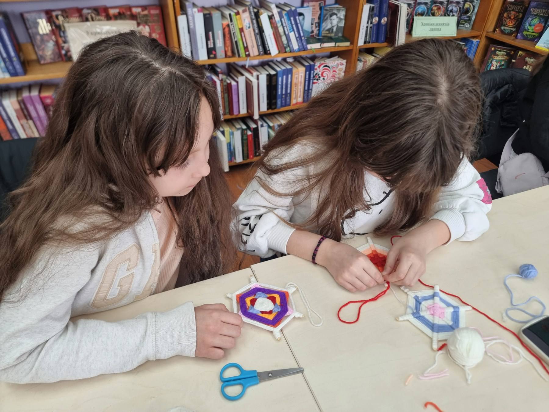 Для плетіння юні майстрині використовували дерев’яні палички та різнокольорові вовняні нитки, створюючи яскраві, унікальні візерунки. Кожна мандала вийшла неповторною – зі своїм настроєм, кольорами та сенсами.