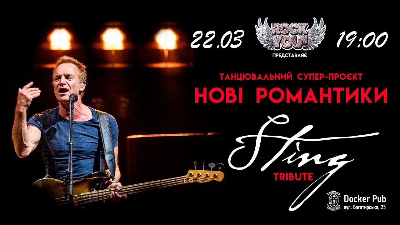 22 березня гурт ROCK YOU в Docker pub з танцювальним супер проєктом “Нові Романтики”. Програма присвячена англійському рок-музиканту Стінгу.