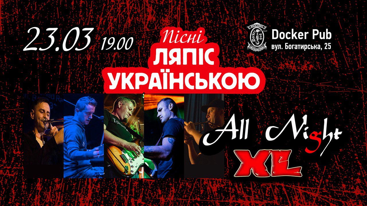 23 березня гурт All Night XL запалюватиме серця яскравим виконанням найкращих хітів «Ляпіса Трубецького» українською в Docker Pub. Старі добрі хіти в новій чудовій обгортці українською мовою. Буде як завжди атмосферно і незабутньо.